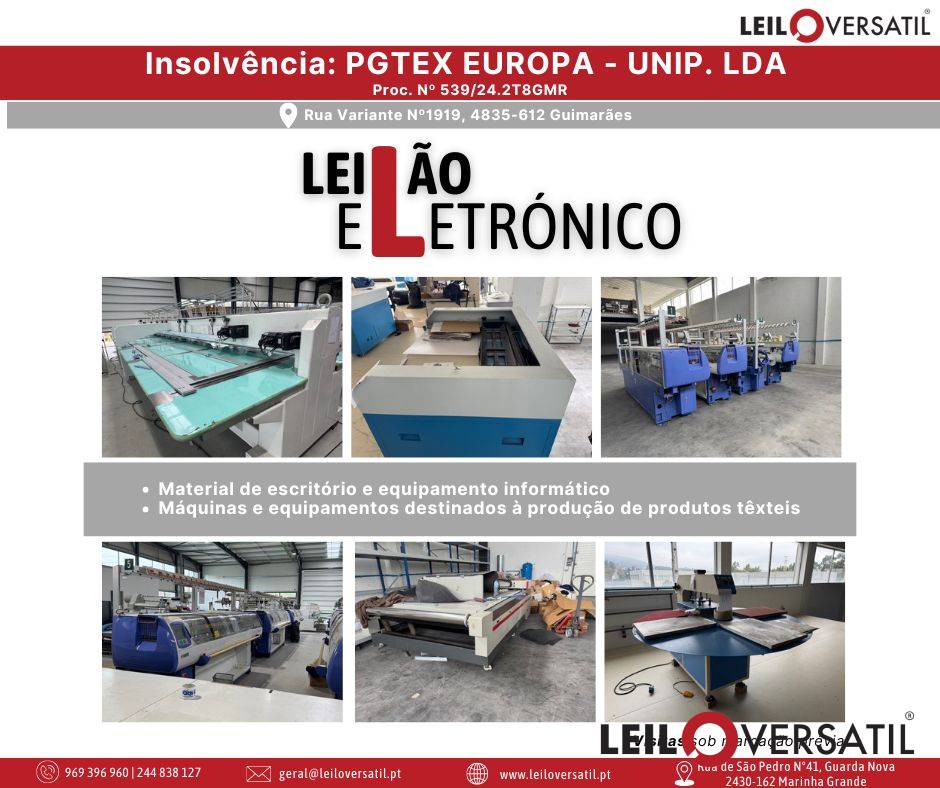 Leilão Eletrónico | Processo nº 539/24.2T8GMR - Insolvência de PGTEX EUROPA - UNIPESSOAL, Lda.